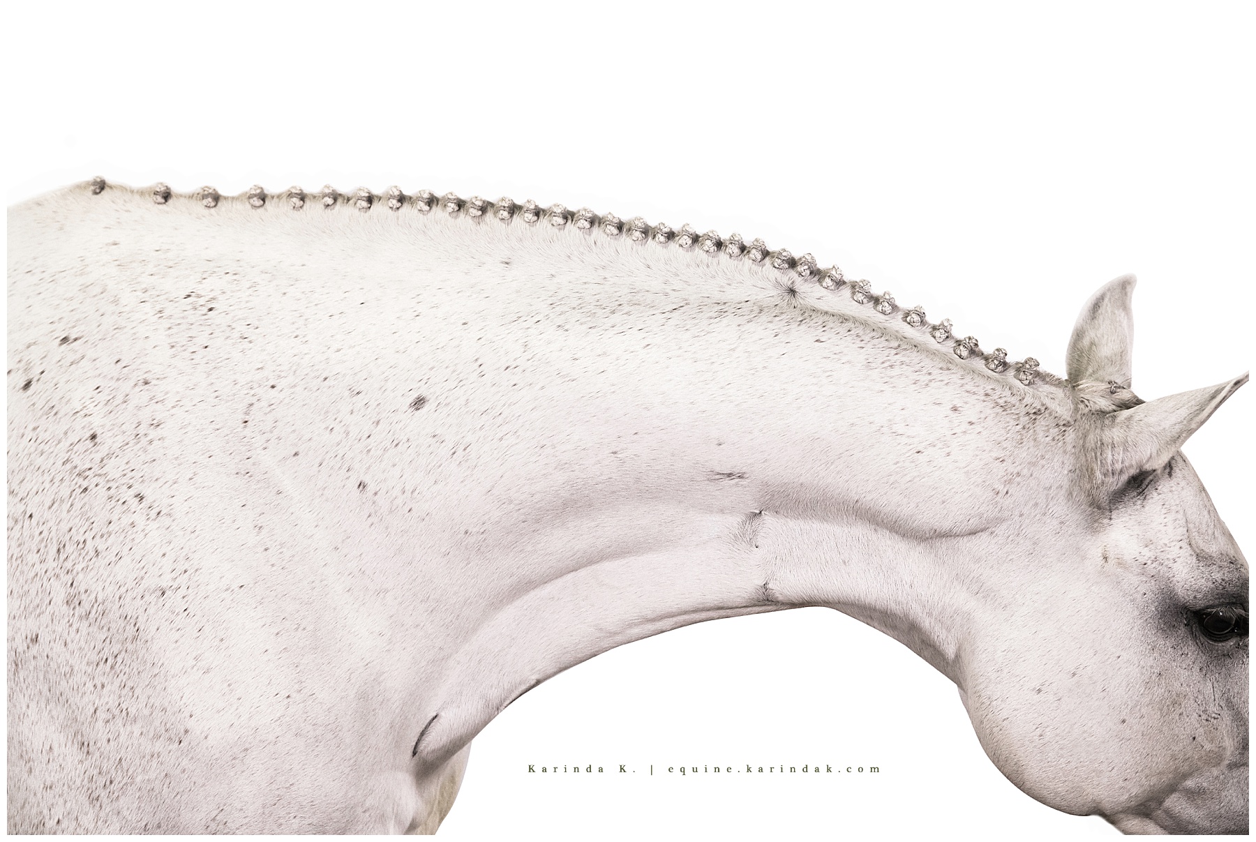 Calvin is a handsome grey gelding who I photographed while at Pin Oak in 2020. He was such a gentleman – a gentle giant – as they say. One of the things that I loved when photographing Calvin was how flexible he was during our session. He is such a big horse with long features and it was amazing being able to get him to get comfortable and stretch out his neck and turn to either side of his body. This allowed me to be able to get some incredibly detailed shots of his picture-perfect braids and the most adorable ears! I especially loved the details in his body I was able to capture, all along his neck and sides he has what are like freckles in horses that give him a special identifying feature.