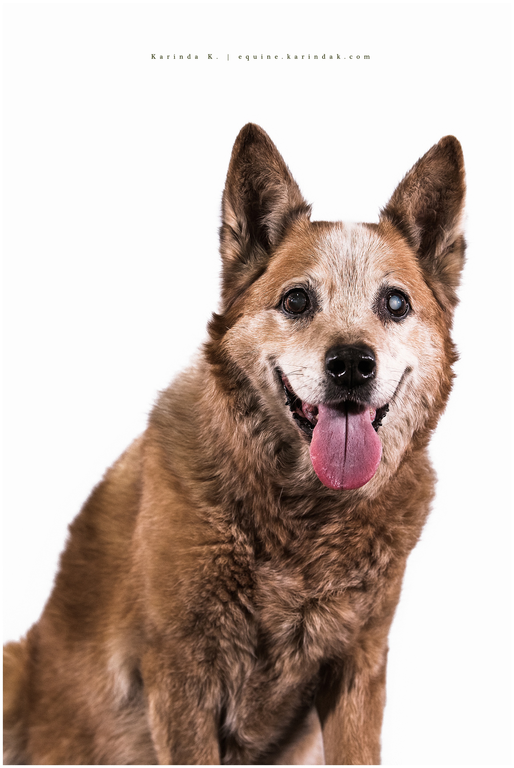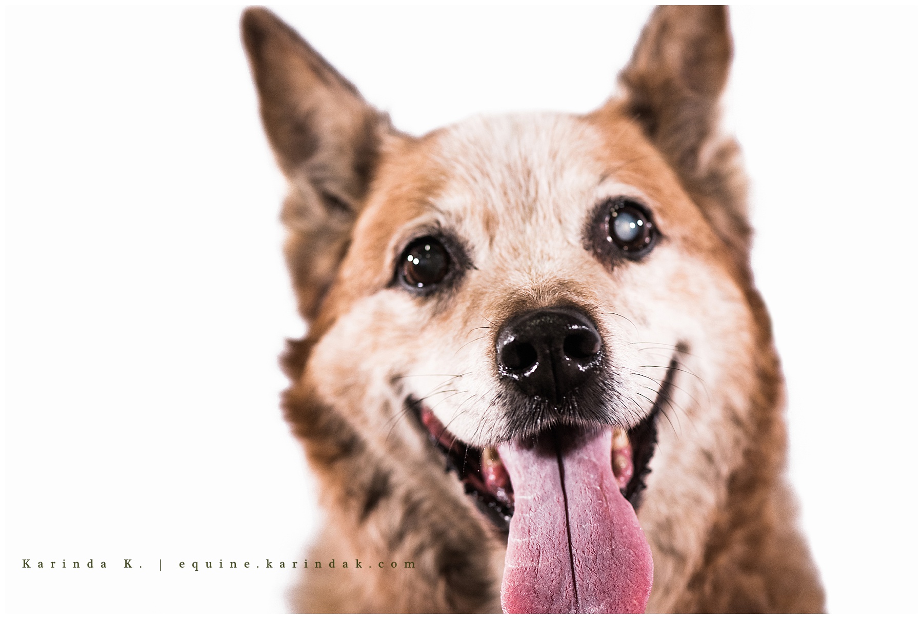 Kit suffered a fibrocartilaginous embolism in 2016 so she doesn’t get to run around quite like she used to, but she still enjoys a visit out to the shows or barns from time to time. You will also probably notice that Kit has a white eye, sometimes as horses and dogs age their eyes can become cloudy and turn a white color as they lose their vision. It tends to look pretty bright and shiny in portraits because the lights tend to light up their eyes. If you are ever around an animal with a white or silver looking eye, just remember that they may have trouble seeing out of that eye so it is always best to talk to them first before you pet them so that they know you are there.