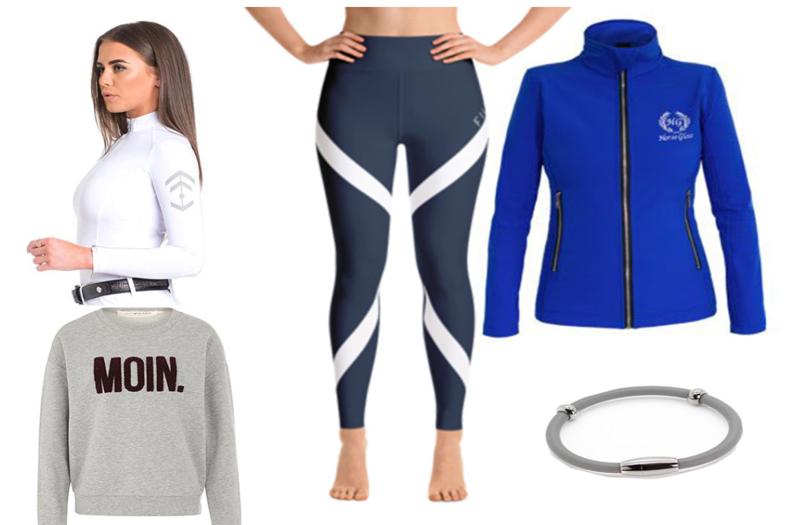 To start with I picked out the new legging range from Fillies Equestrian, the Navy and White Cross effect is eye catching. Comfy and easily wearable when popping to the shops or for a quick workout. Aztec Diamond Equestrian have a great range of base layers and this stunning white top is versatile so a definite must have for the wardrobe. It can be used for this casual look but also for a show/competition.   I love a good sweater or hoody and the Moin sweat from Inselpferd (inselpferd.de) Grey is a great colour to accompany blues and the simplicity of the detail with this top works well. Add a splash of colour with the Soft Shell Jacket from Horse Gloss in Royal Blue. A soft shell jacket is great for being around the horses when you are busy working away but want to avoid the sharp winter winds.